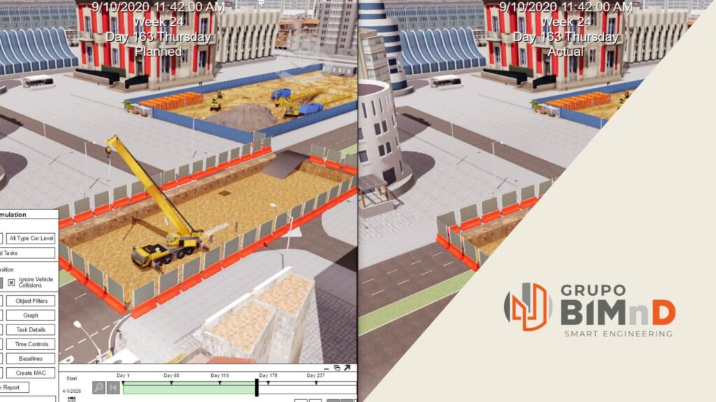 Software de simulación 4D con visualización inmersiva, integración con RV y análisis constructivos basados en modelos.